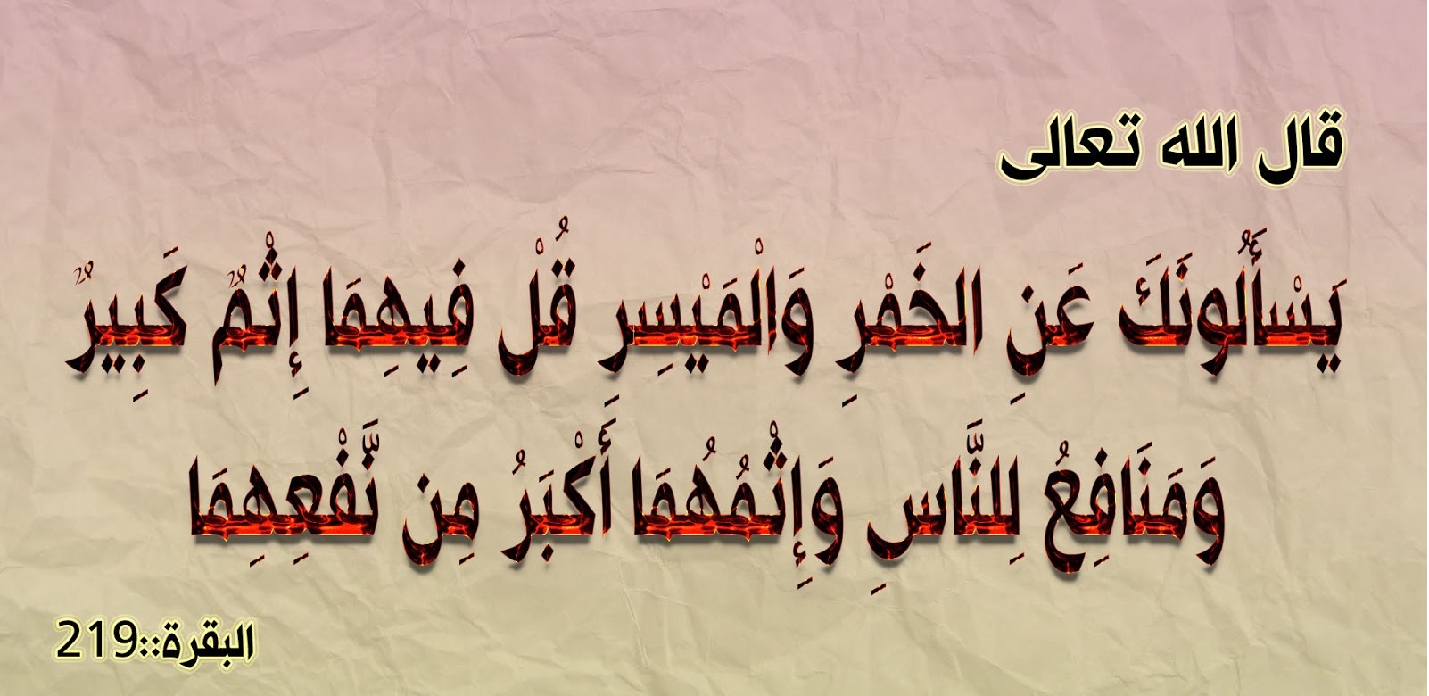 ﴿یَسْئَلُونَکَ عَنِ الخَمْرِ وَالمَیْسِرِ قُلْ فِیهِمَآ إِثْمٌ کَبِیرٌ وَمَنَافِعُ لِلنَّاسِ وَإِثْمُهُمَآ أَکْبَرُ مِنْ نَّفْعِهِمَا﴾ [بخشی از آیهٔ ٢١٩، سوره بقره]